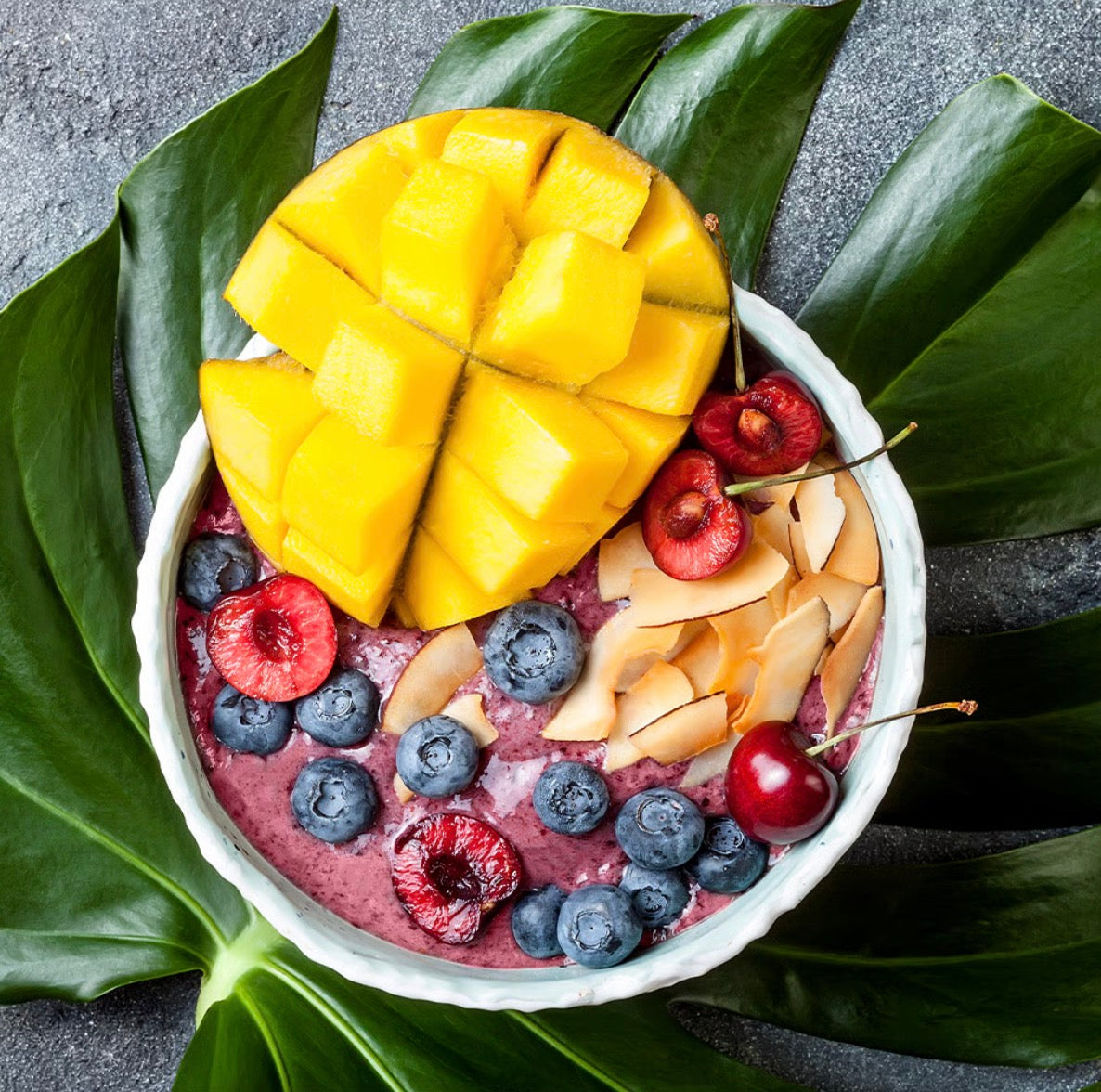 A fruit medley of apple, banana, cherry, raspberry, and peach are wrapped in tropical jungle palm leaves and kissed with a sweet base of sugar cane.