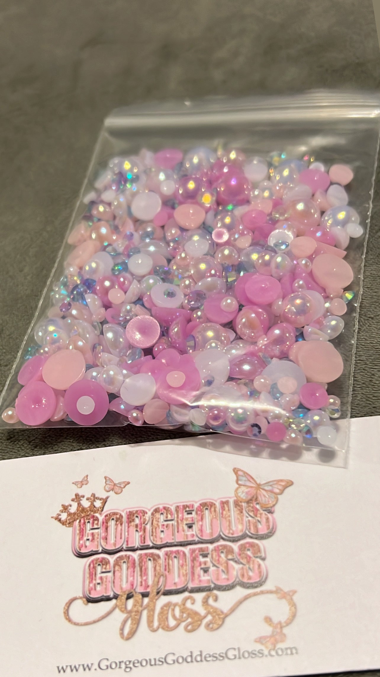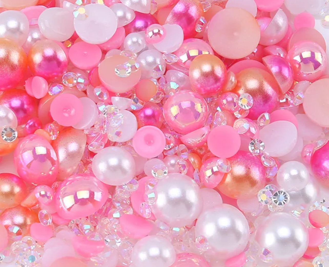 PRETTY MIXES contains a beautiful mixture of both flatback half round imitation pearls and flatback resin rhinestones in an assortment of sizes. The half round pearls come in a mixture of colors and sizes of 3/4/5/6/8/10mm, and may or may not also include a size 12mm and or 14mm. The resin rhinestones included in the mix come in a variety of sizes of 3/4/5/6mm. These mixes are such a great way to get an assortment of colors and sizes without having to buy each item individually.