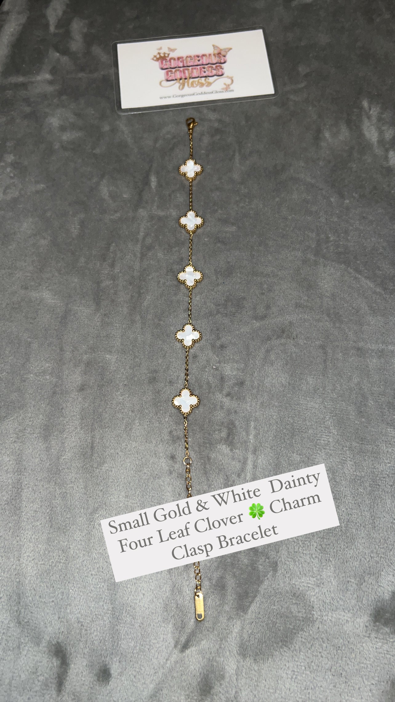 Small Gold & White Dainty Four Leaf Clover 🍀 Charm Clasp Bracelet